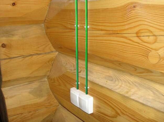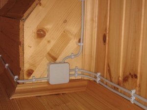 Стоит учитывать, что в деревянном доме прокладка кабеля должна проводиться с использованием не поддерживающих горение металлической или пластиковой гофрированной трубы, специальных плинтусов или коробов, обеспечивающих дополнительную защиту горючего основания стены от проводки.